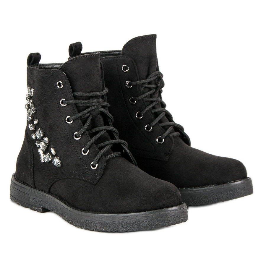 Eine formschöne, runde Spitze und ein flacher 3 cm hoher Absatz sorgen für höchsten Tragekomfort, die stylische Schnürung und der Reißverschluss ermöglichen ein einfaches An- und Ausziehen. Die Strasssteine auf dem Obermaterial sorgen für einen modischen Touch und machen diese Stiefel zu einem echten Hingucker.