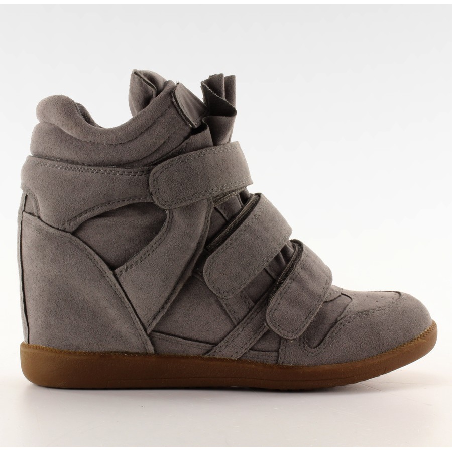 Wildleder-Sneaker mit Kissen 6039 D. Grau – graue, stylische und bequeme Sneakers mit verstecktem Keilabsatz (8 cm). Aus ökologischem Wildleder gefertigt, mit breiten Klettverschlüssen befestigt, mit dicker Zunge und weichem Polster, das ihren Charakter unterstreicht und den Tragekomfort verbessert. Perfekt für alle, die einen urbanen Look mit zusätzlicher Höhe bei gleichzeitigem Komfort suchen.