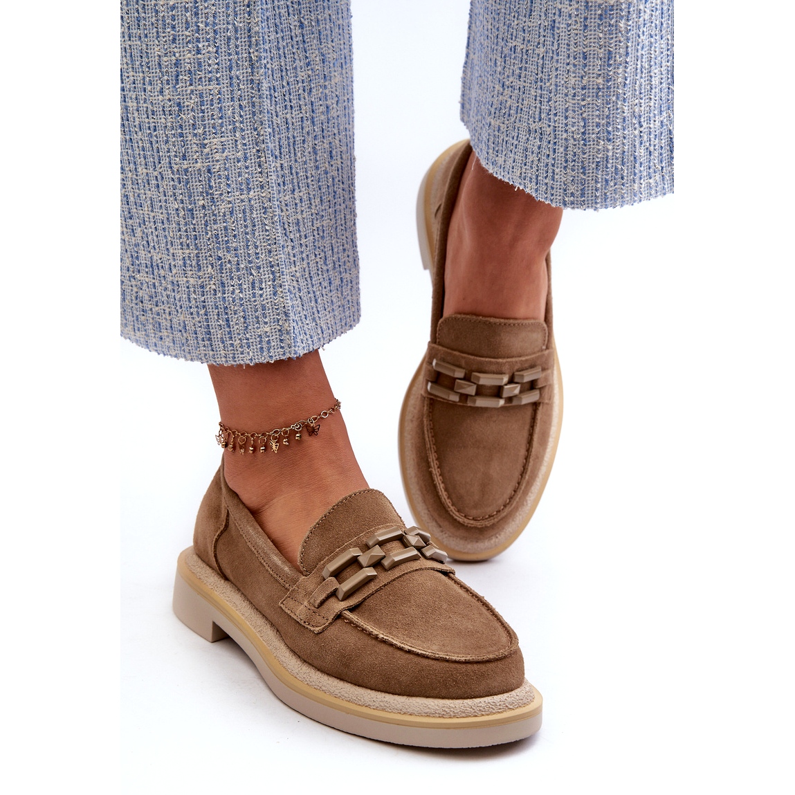 Das dekorative Element an der Vorderseite in Form einer eleganten Kette verleiht ihnen Originalität und macht sie zu einer perfekten Ergänzung zu lässigen und eleganteren Stilen. Runde -fallende Zehen passen perfekt in aktuelle Trends und bieten gleichzeitig Bewegungsfreiheit.