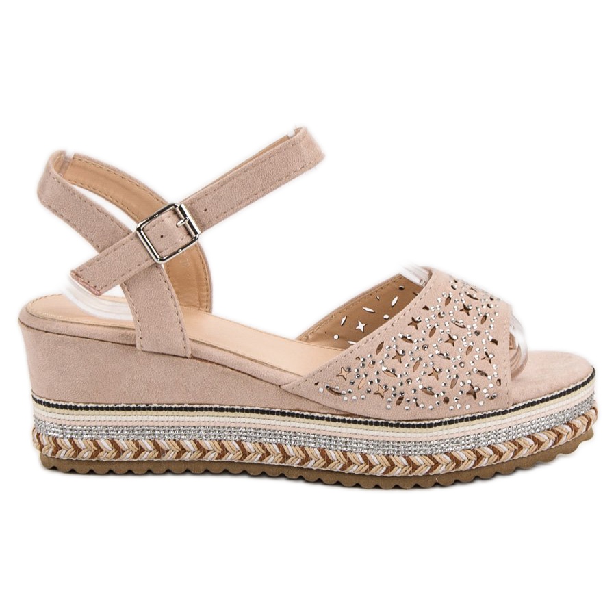 Groto Gogo-Sandalen zeichnen sich durch einen einzigartigen Riemen an der Vorderseite aus, der mit winzigen Ausschnitten in verschiedenen Formen und glänzenden Strasssteinen verziert ist. Aus ökologischem Wildleder gefertigt, kombiniert mit einer mehrere Zentimeter hohen Plateausohle, sorgen sie für Komfort und Stabilität beim alltäglichen Styling. Sie werden sehen, dass das bunte Band ihnen Charakter verleiht und die Schnalle das Anlegen und Anpassen erleichtert.