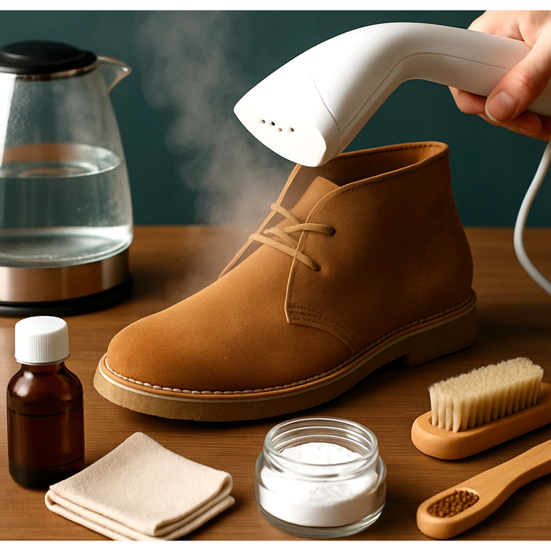 Wasserdampf wirkt auf Wildlederschuhen wie von Zauberhand. Halten Sie Ihren Schuh über einen Dampfkessel (nicht zu nah!) oder verwenden Sie einen Dampfgarer. Dampf hebt die Wildlederhaare an, frischt die Farbe auf und entfernt leichte Verschmutzungen. Warten Sie nach dem Dämpfen, bis der Schuh getrocknet ist, und bürsten Sie ihn dann mit einer Wildlederbürste ab. Weißer Essig, verdünnt mit Wasser (1:1), auf ein weiches Tuch aufgetragen, hilft, Flecken zu entfernen und die Farbe aufzufrischen. Leicht abwischen, kein Reiben. Auf fettige Flecken gestreutes Natron absorbiert das Fett über Nacht – sanft ausschütteln und morgens abbürsten.