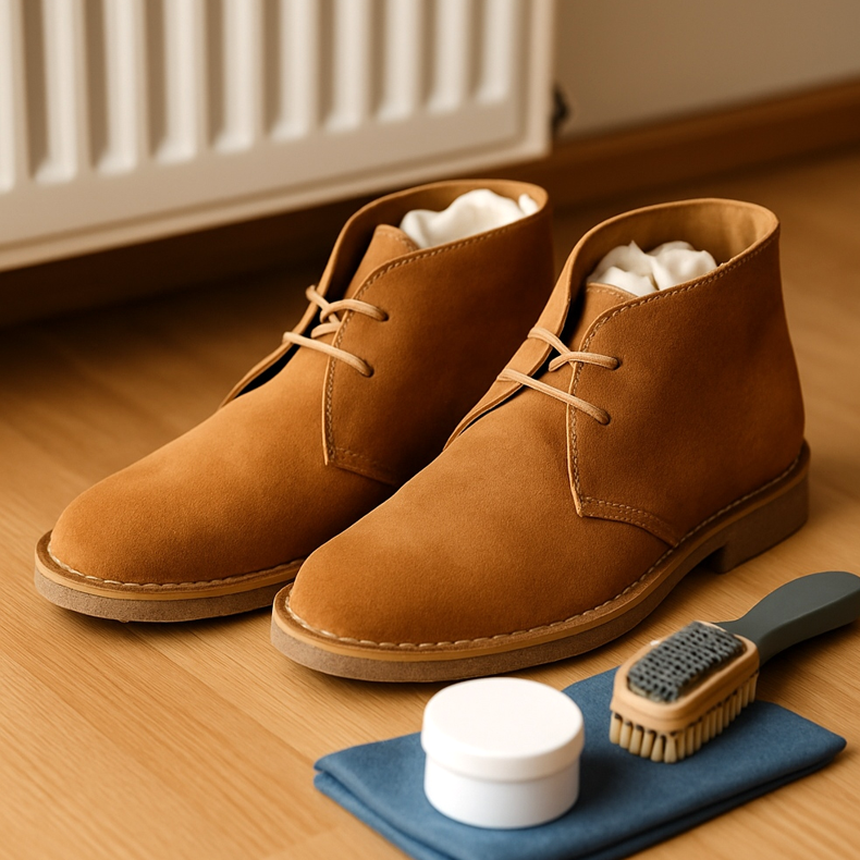 Trocknen Sie Wildlederschuhe niemals auf der Heizung, in der Nähe eines Ofens oder in der Sonne – das Wildleder schrumpft und verhärtet. Trocknen Sie die Schuhe immer bei Raumtemperatur und füllen Sie die Schuhe mit Papier (kein Zeitungspapier – es kann sich verfärben) oder Formen. Reinigen Sie Wildleder nicht direkt mit Wasser, sondern nur mit einem leicht feuchten Tuch. Reiben Sie keine Schuhcreme, Politur oder Lotion auf Glattleder ein – dies verstopft die Poren und zerstört die Textur. Verwenden Sie keine zu harte Bürste – diese beschädigt die empfindlichen Borsten des Wildleders. Tragen Sie Wildlederschuhe nicht im Regen, ohne sie vorher zu imprägnieren – das Wildleder nimmt schnell Wasser auf und kann dauerhaft beschädigt werden.