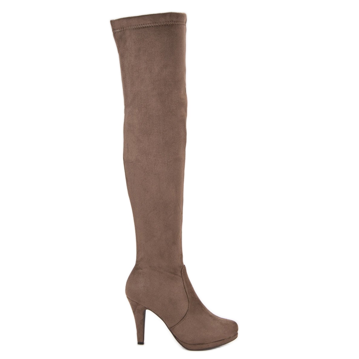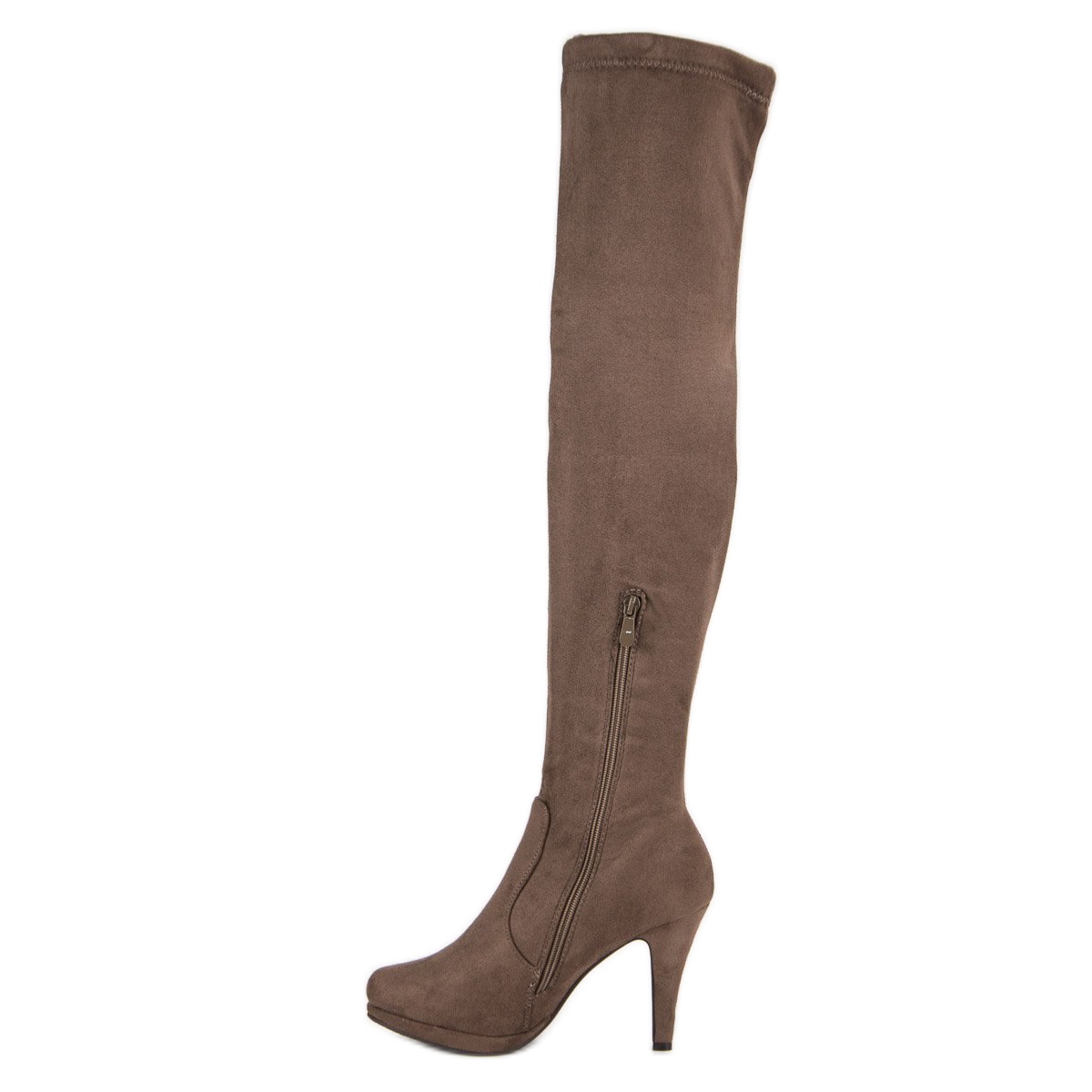 Wir präsentieren Wildleder-Stiletto-Stiefel des renommierten Herstellers Super Me. Diese einzigartigen braunen Schuhe sind die perfekte Wahl für Frauen, die ihrem Styling ein bisschen Eleganz und Sexappeal verleihen möchten. Oberschenkelhohe Stiefel, die über das Knie reichen, mit flexiblem Schaft passen sich perfekt der Figur an und sorgen für Tragekomfort an kälteren Tagen.