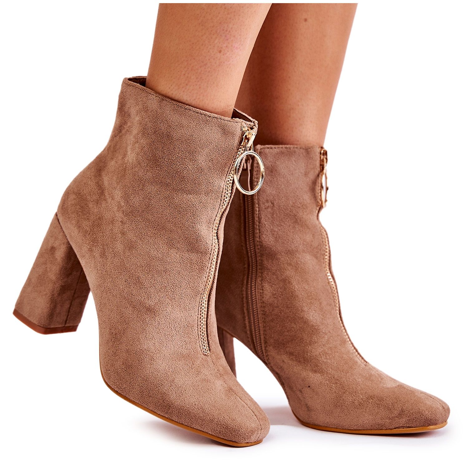 Die Stiefel haben ein Obermaterial, das den Knöchel bedeckt, und eine quadratische Spitze, was sie zur perfekten Wahl für kältere Tage macht. Aus hochwertigem Öko-Wildleder gefertigt, sehen sie äußerst elegant aus. Der Reißverschluss erleichtert das Anziehen und der dekorative Reißverschluss mit Anhänger verleiht dem gesamten Look eine schicke Note.