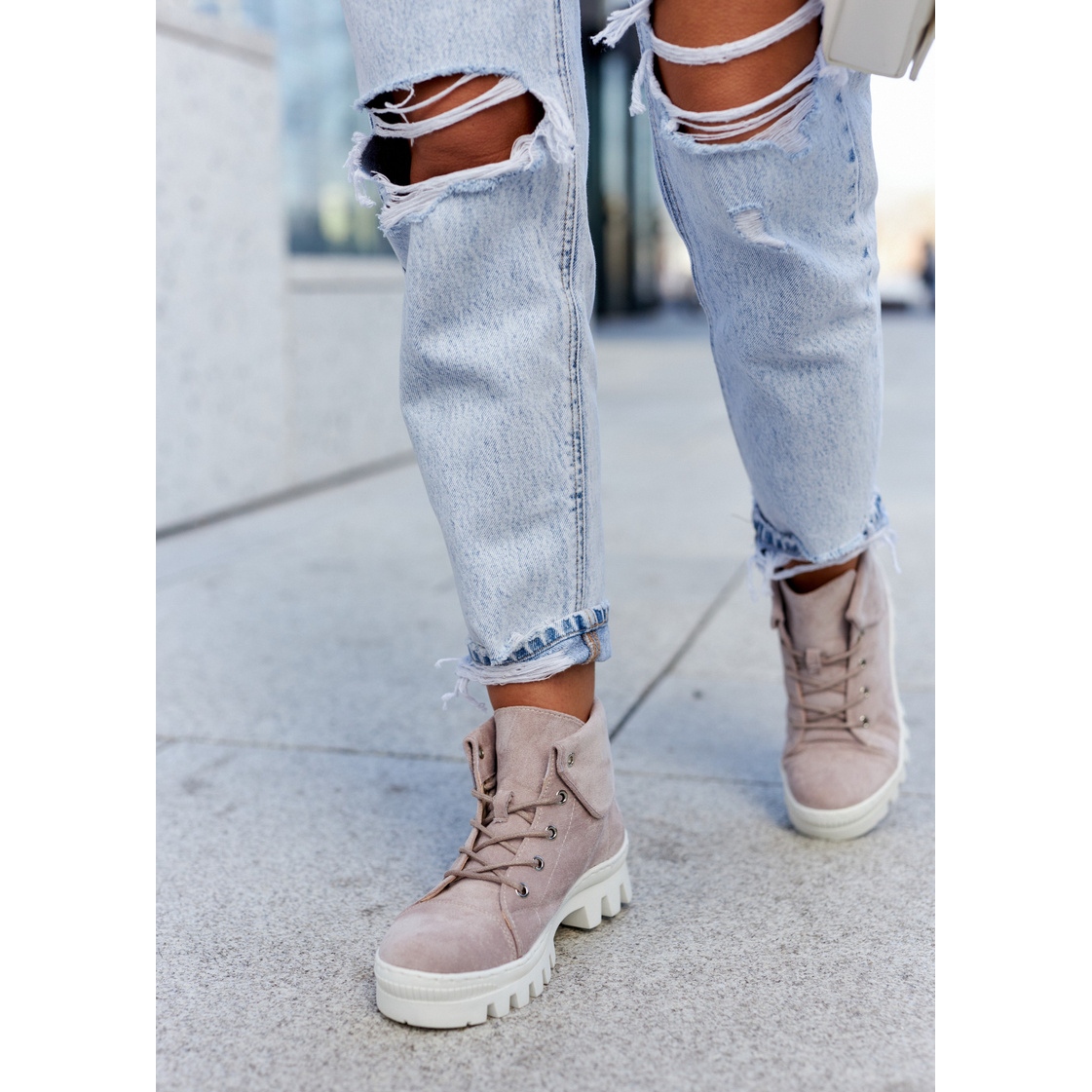 Stilvolle und komfortable Stiefel, die Casual -Sets Charakter verleihen. Hergestellt aus ökologischem Wildleder in einem modischen, leichten Schatten. Setzen Sie auf eine dicke, geschnittene Sohle mit einer abgerundeten, versteiften Nase und Schnürung für runde Schnürsenkel. Der Obere erreicht den Knöchel und wird leicht aufgerollt, was von ihrer Stadt, dem informellen Charakter, hervorgehoben wird.