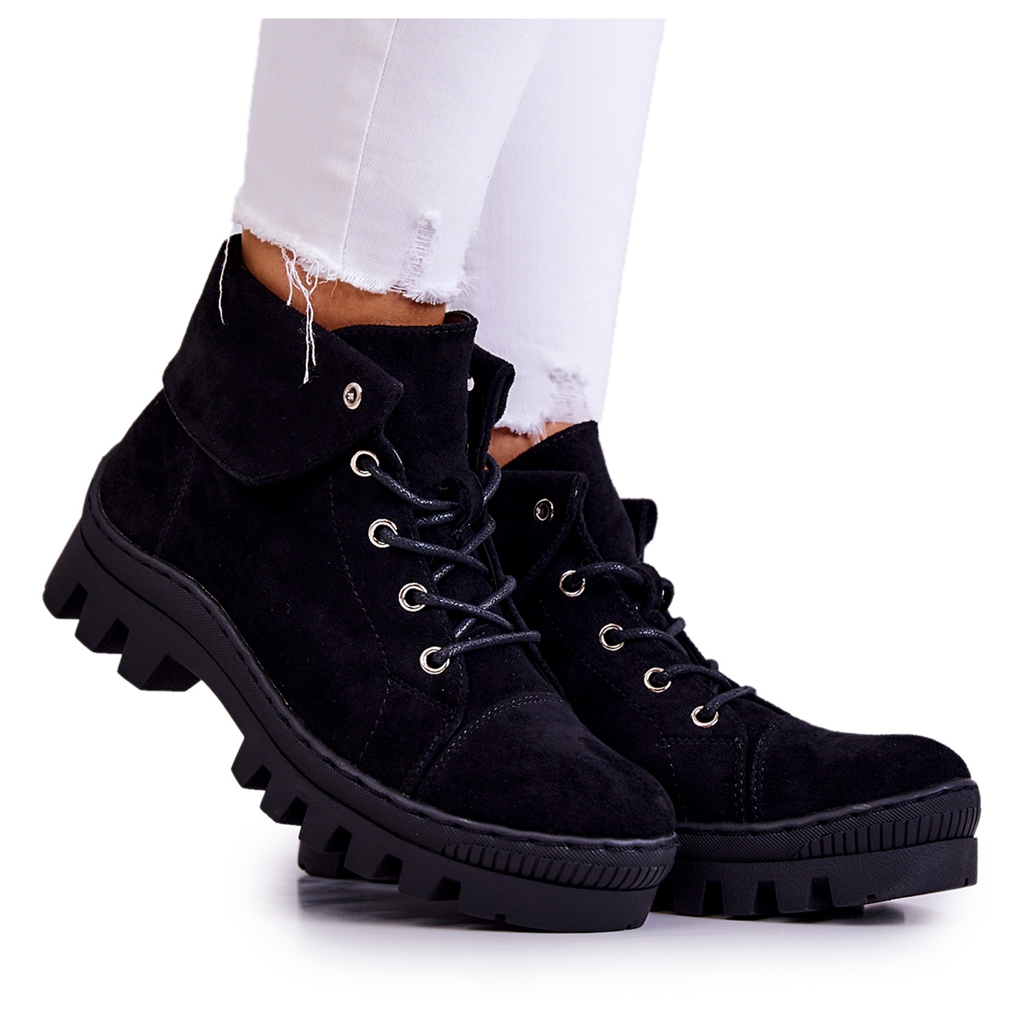 Die Stiefel werden mit runden Schnürsenkeln gebunden, was für eine perfekte Passform am Fuß sorgt. Auf einer dicken Sohle mit modischen Cut-Outs, die Charakter verleihen, garantieren diese Stiefel nicht nur Stil, sondern auch Stabilität. Die Spitze des Schuhs ist versteift und abgerundet, was für ein angenehmes Tragegefühl sorgt.