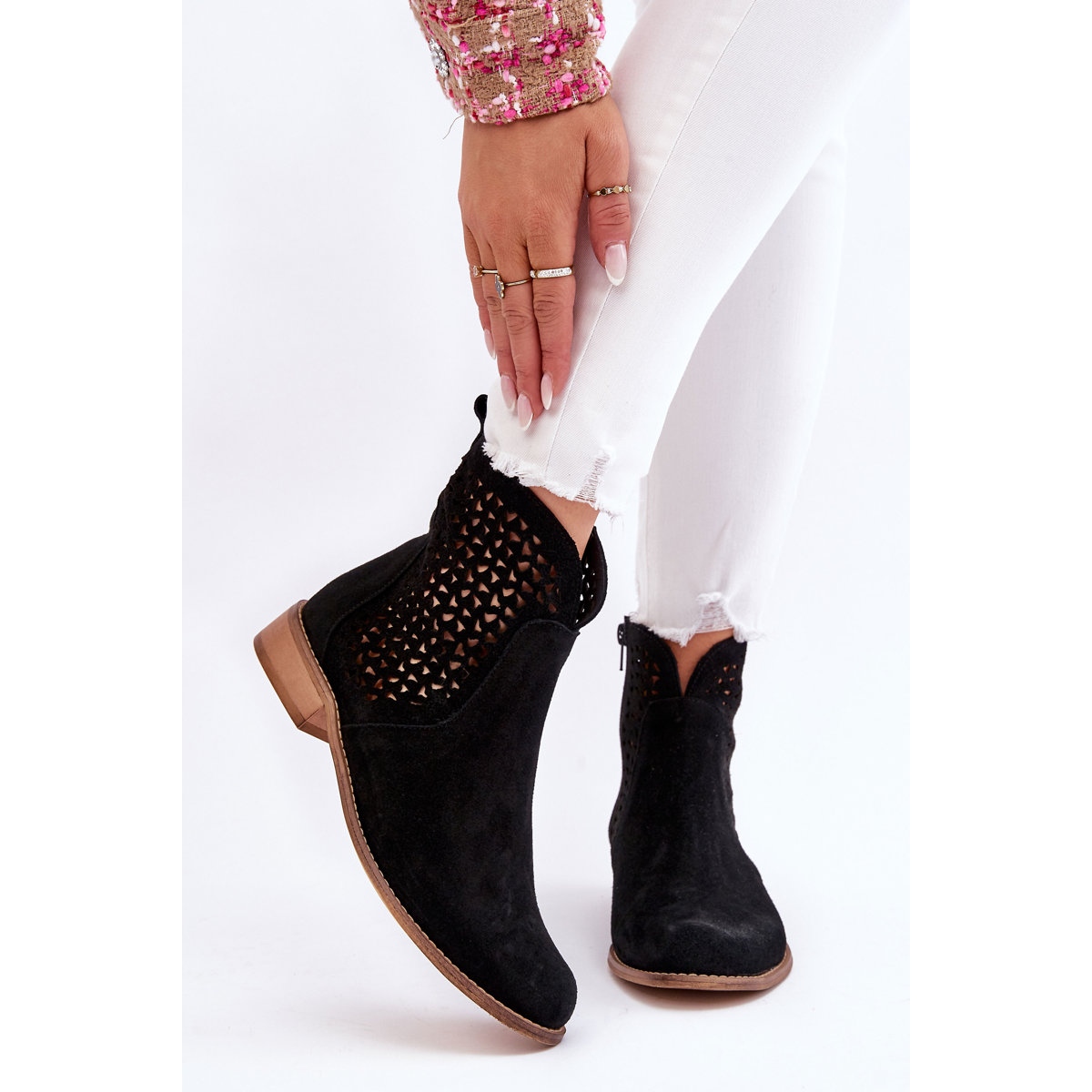 Wildlederstiefel Nicole 2791/028 - elegant, komfortabel und universell, täglich perfekt und für stilvollere Stile. Hergestellt aus natürlichen Wildleder in einer klassischen schwarzen Farbe, mit einer leichten offenen Arbeitskoration, die ihnen subtile Leichtigkeit verleiht. Der auf der Seite genähte Schieberegler erleichtert das Anziehen, und eine flache Ferse (3 cm) sorgt den ganzen Tag von Komfort. Der natürliche Ledereinsatz erhöht den Komfort und die Atmungsaktivität. Das Modell reicht nach dem Knöchel (obere Höhe 14 cm) - eine gute Wahl für Hosen, Röcke und Kleider.