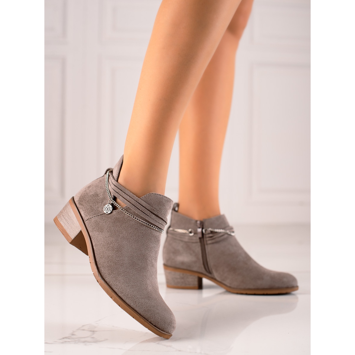 Diese Stiefeletten aus hochwertigem Wildlederimitat bieten einen eleganten Look und sind gleichzeitig praktisch. Der dekorative Riemen und die Kette verleihen ihnen einen einzigartigen Charakter und die runde Nase sorgt für Komfort auch bei längerem Tragen.
