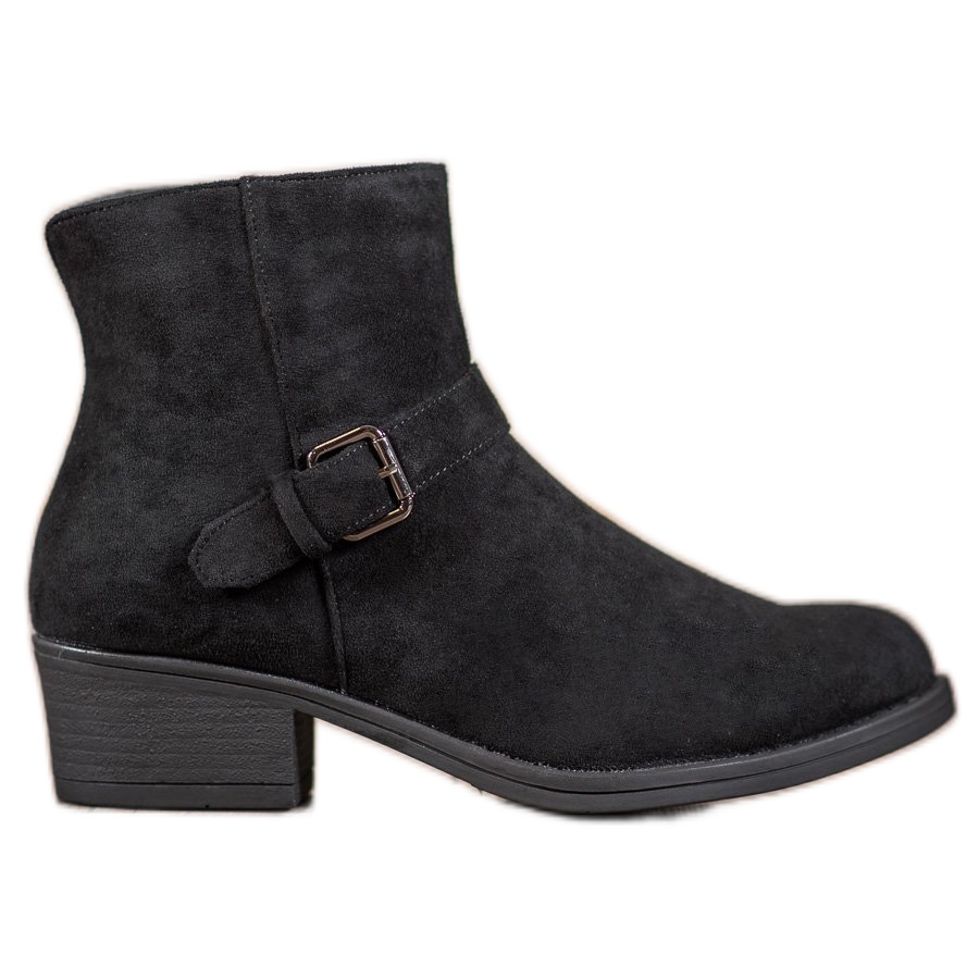 Wir präsentieren J. Star Wildleder-Stiefeletten mit Schnalle in elegantem Schwarz, die eine perfekte Ergänzung für Ihre Garderobe sein werden. Diese modischen und bequemen Damen-Stiefeletten sind aus ökologischem Wildleder höchster Qualität gefertigt, was nicht nur für ein ästhetisches Erscheinungsbild, sondern auch für Tragekomfort sorgt.