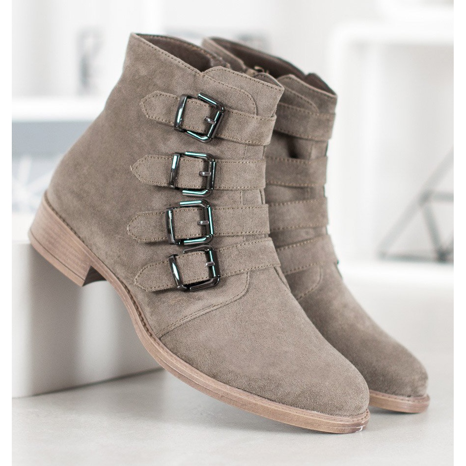 Die Stiefeletten reichen bis über den Knöchel und sind somit eine perfekte Ergänzung zu lässigen Styles. An der Seite des Obermaterials befindet sich ein Reißverschluss, der das Anziehen erleichtert, und an der Vorderseite der Schuhe befinden sich dekorative Metallschnallen, die ihnen einen einzigartigen Charakter verleihen. Abgerundete Spitzen und ein weicher, eingearbeiteter Absatz machen die Stiefel äußerst bequem, die Absatzhöhe von 3 cm sorgt für Stabilität.