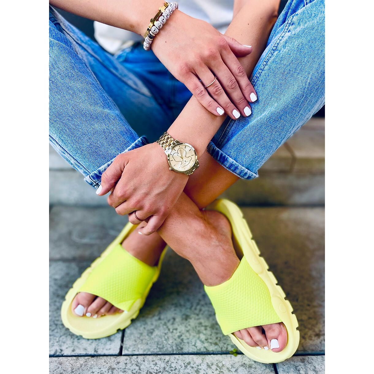 Details: Windgelbe Damenhausschuhe