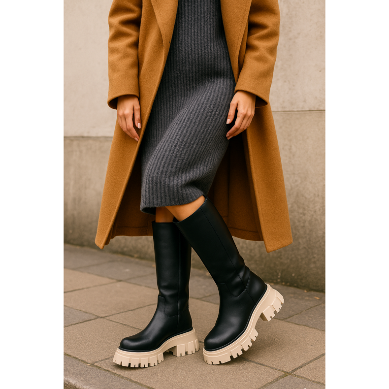 Massive Sohlen sind ein absoluter Hit von Winter 2025! Stiefel auf einer dicken, Traktorsohle fügen nicht nur Zentimeter hoch, sondern sorgen auch für die Stabilität auf rutschigen Oberflächen. Dieser Trend passt perfekt in die Ästhetik von Gorpcore und verbindet die Funktionalität mit dem städtischen Stil. Wählen Sie Modelle mit einer kontrastierenden Sohle - schwarze Stiefel mit einer weißen oder beige Sohle erzeugen einen interessanten visuellen Effekt. Diese Schuhe werden in Kombination mit übergroßen Mänteln und Wollkleidern perfekt sein.