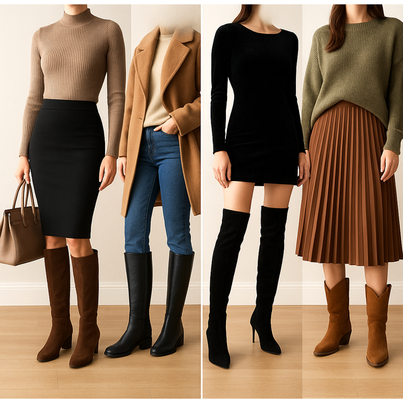 Stiefel sind äußerst vielseitige Schuhe, die in vielerlei Hinsicht getragen werden können. Für die Arbeit: Wählen Sie elegante High Heels und kombinieren Sie sie mit einem Bleistiftrock und einem passenden Pullover. Jeden Tag: Wetten Sie auf komfortable Models auf einer flachen Sohle, die mit Jeans und einem übergroßen Mantel großartig aussehen. Für den Abend: Musketiere auf einer Pin in Kombination mit einem Mini -Kleid bilden einen sexy Look. Wochenende: Cowboy -Stiefel stimmen losen Pullovern und plissierte Midi -Röcke an.