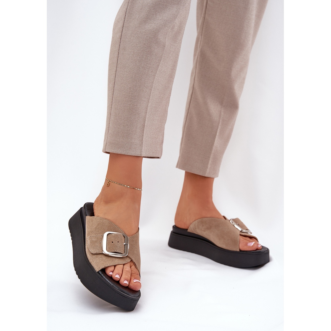 Auf einer stabilen Plattform mit einer Höhe von 3,5 cm bieten sie während der täglichen Spaziergänge Komfort und Unterstützung. Mit einer großen Schnalle mit einem verstellbaren Riemen können Sie perfekt zum Fuß passen, wodurch die Flip -Flops nicht nur stilvoll, sondern auch praktisch sind. Dank eines weichen, Ledereinsatzes ist es ein wahres Vergnügen, sie den ganzen Tag zu tragen.