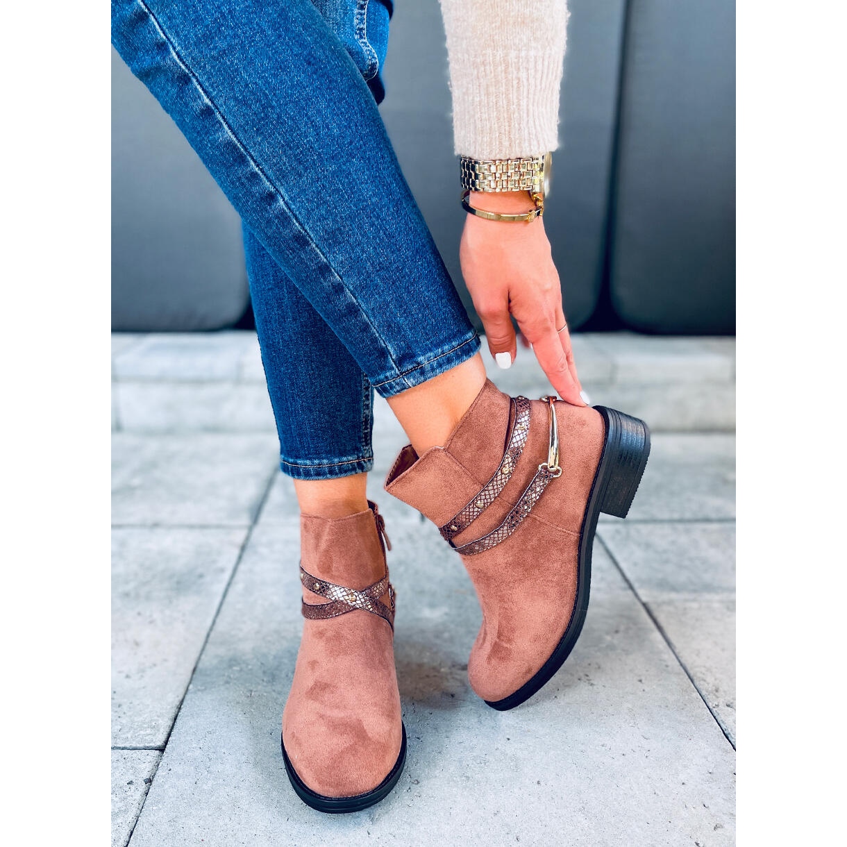 Wir präsentieren die Wildlederstiefeletten Zinaida Camel für Damen, die durch ihr modisches Design und außergewöhnlichen Komfort begeistern. Diese braunen flachen Stiefel sind die perfekte Wahl für den Alltag und kombinieren Eleganz mit Funktionalität. Das Obermaterial, das sich dezent um den Knöchel schmiegt, ist mit Streifen mit Schlangenledermotiv verziert, was ihnen einen einzigartigen Charakter verleiht.